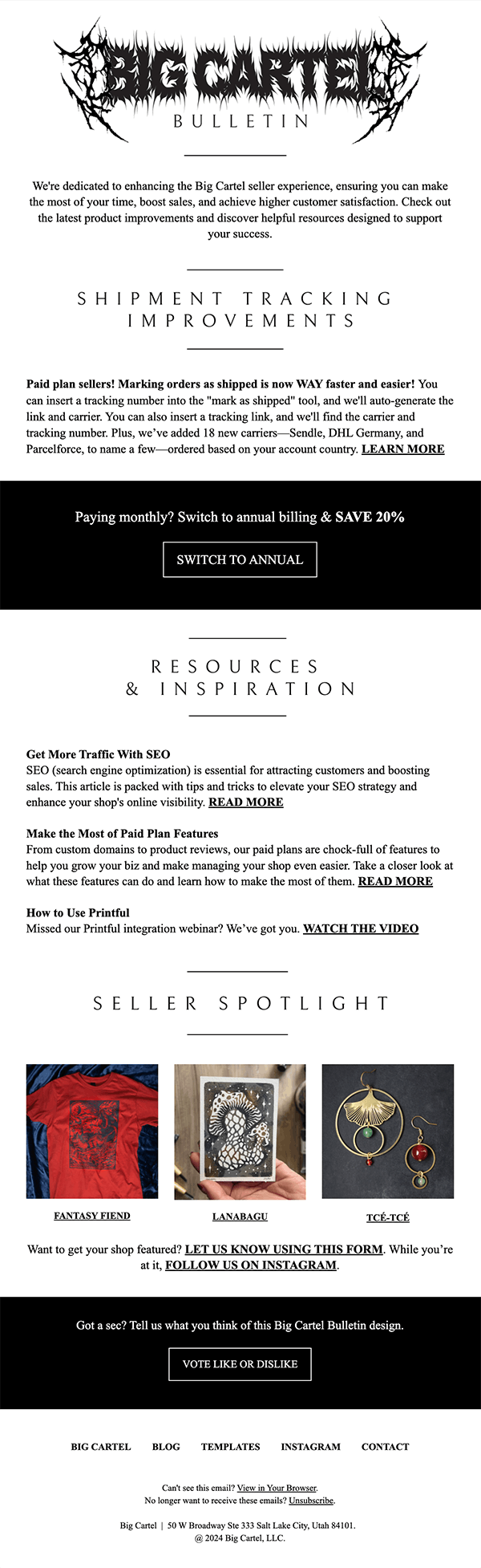 We're dedicated to enhancing the Big Cartel seller experience, ensuring you can make the most of your time, boost sales, and achieve higher customer satisfaction. Check out the latest product improvements and discover helpful resources designed to support your success.