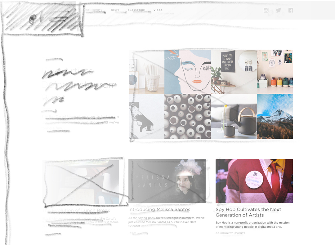 To save design and prototyping time we first looked at a ton of different sites for inspiration. From simple, easy to navigate sites, like Medium, to more expressive, freeform sites like VSCO. We landed somewhere in the middle. Taking the things that we liked and dropping the things that we didn't, and combining them into something unique to Big Cartel.