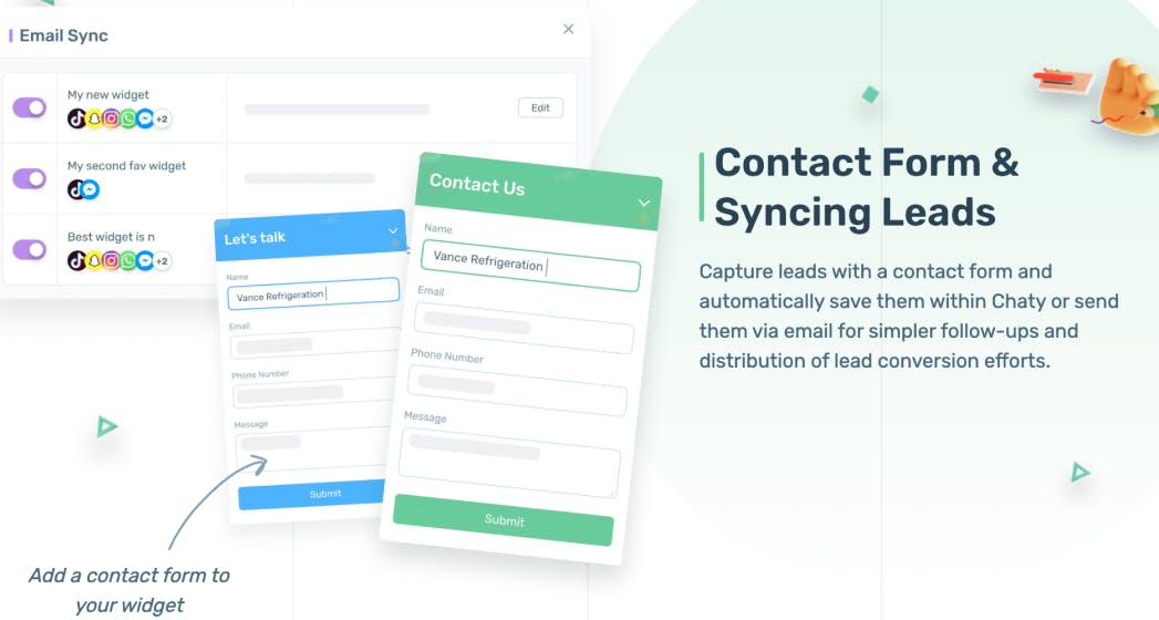 - Lead Capture & Syncing: Capture leads through a built-in contact form and sync them automatically within Chaty or send them via email for easy follow-up.