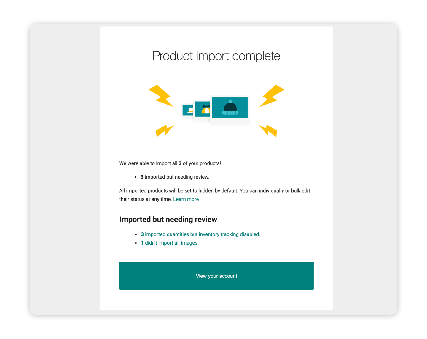 After importing your products, you'll receive an email report letting you know how your import went. The email will let you know if everything worked great, if one or more products need review, or if any were unable to be imported at all due to errors.