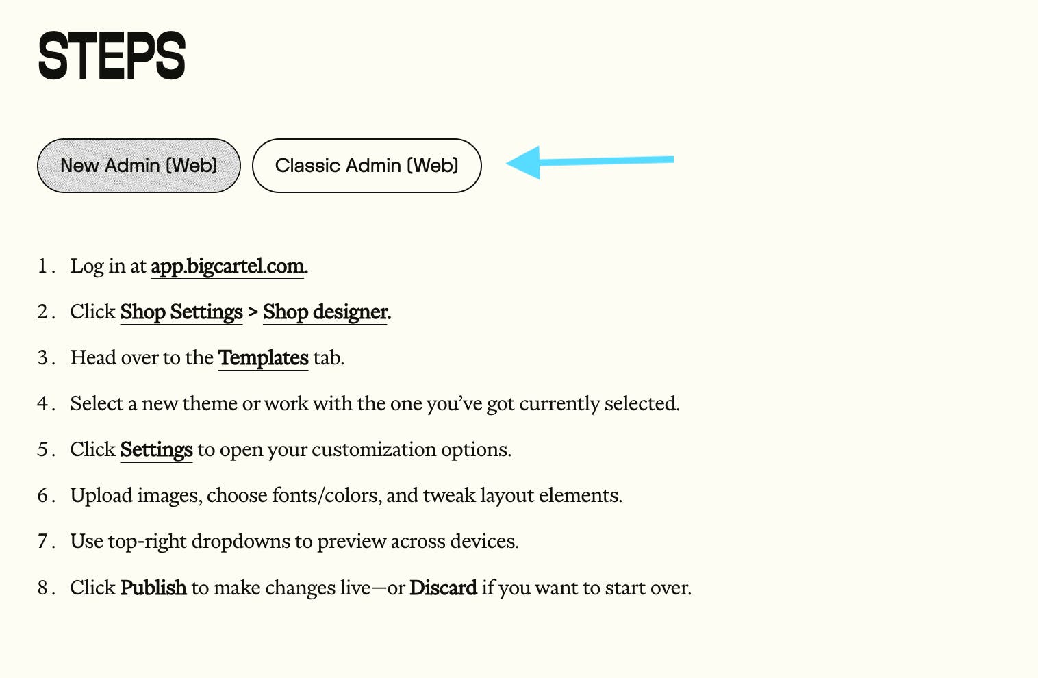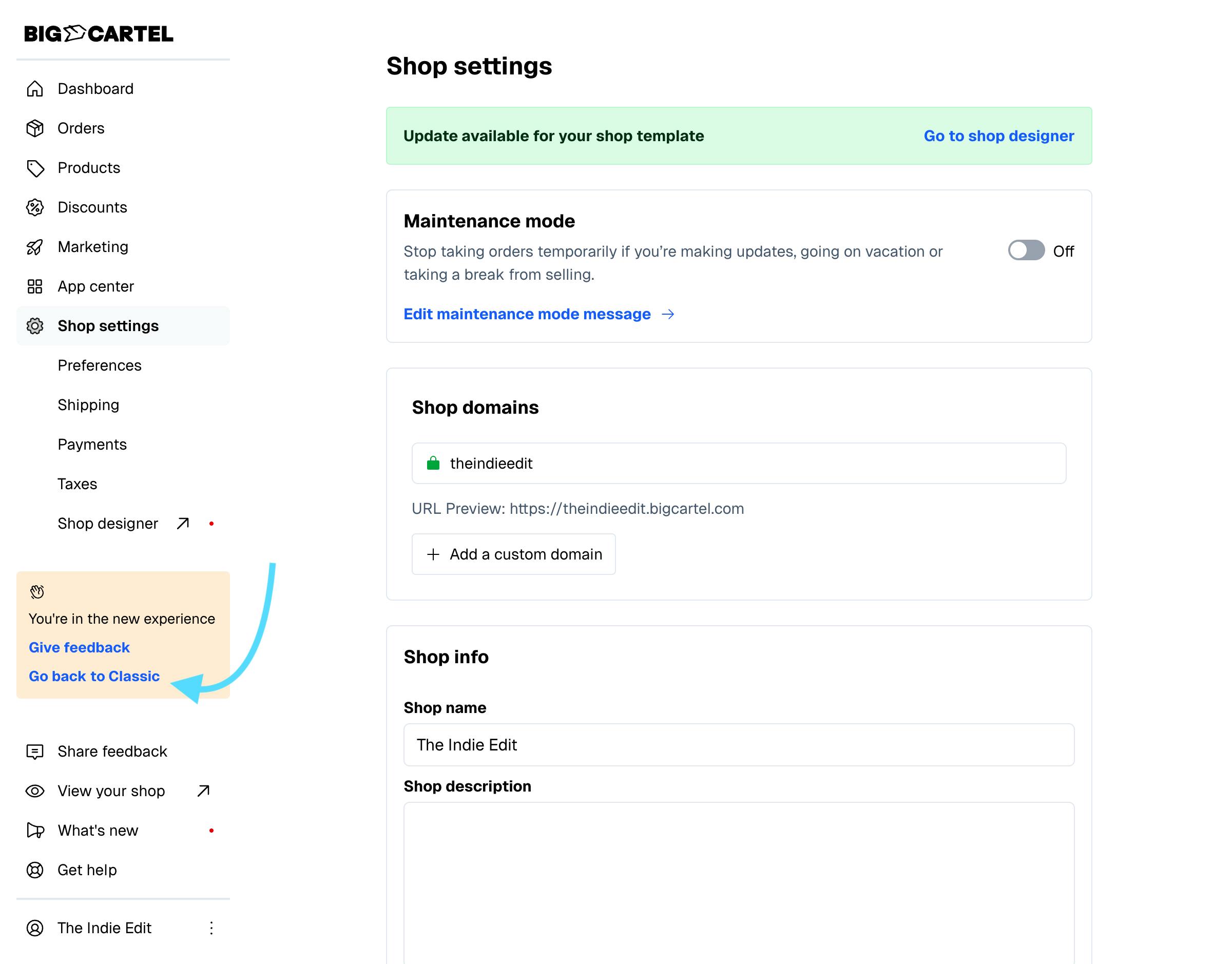 - When logged into your shop at my.bigcartel.com, you’ll land in the Classic Admin by default.