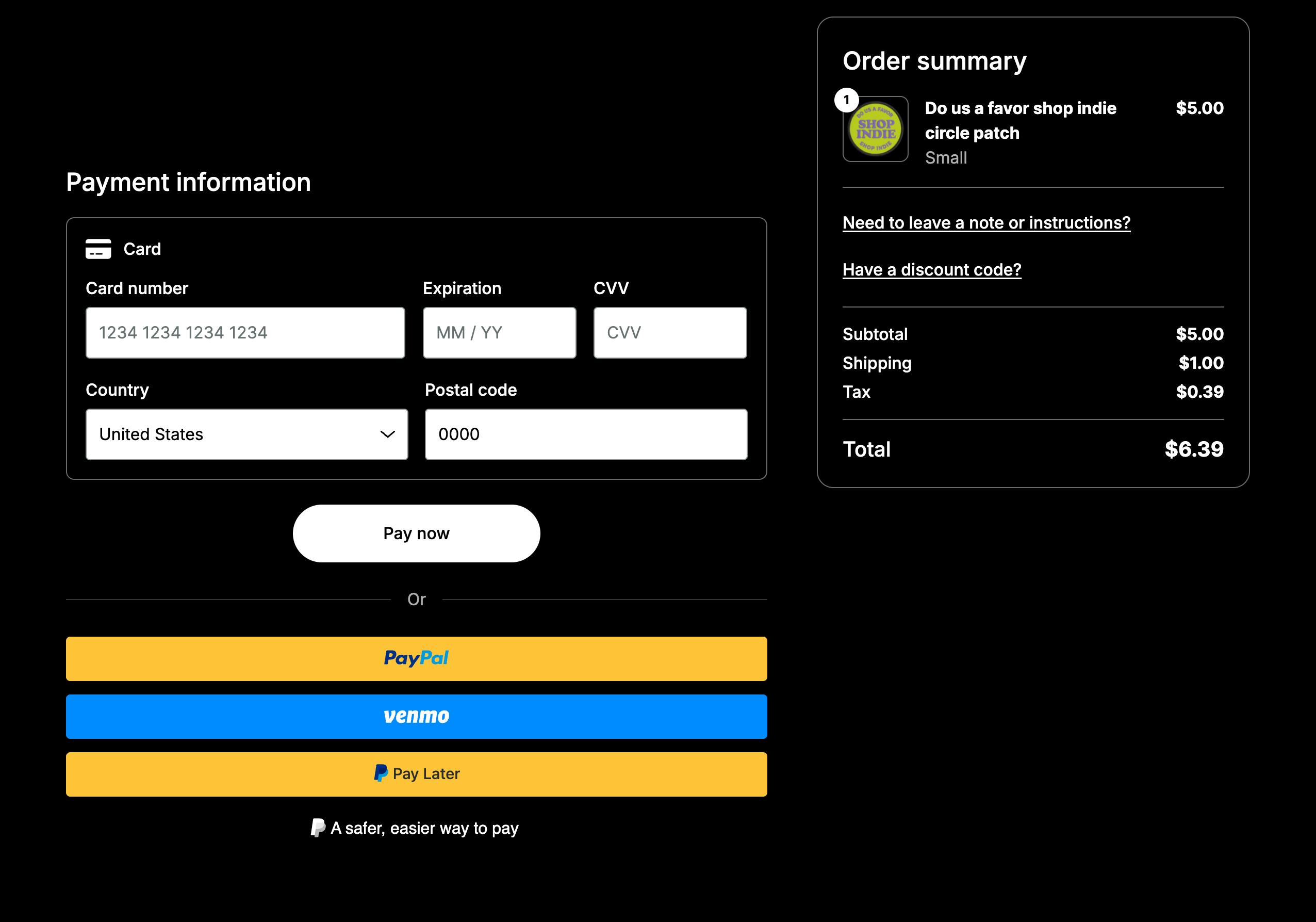 Advanced Credit and Debit Card Payments is a payment solution provided by PayPal that gives your customers another way to pay. They’ll have the option at checkout to either enter their card details directly into your shop’s checkout page or log in and pay with a PayPal or Venmo (for U.S. domestic orders).