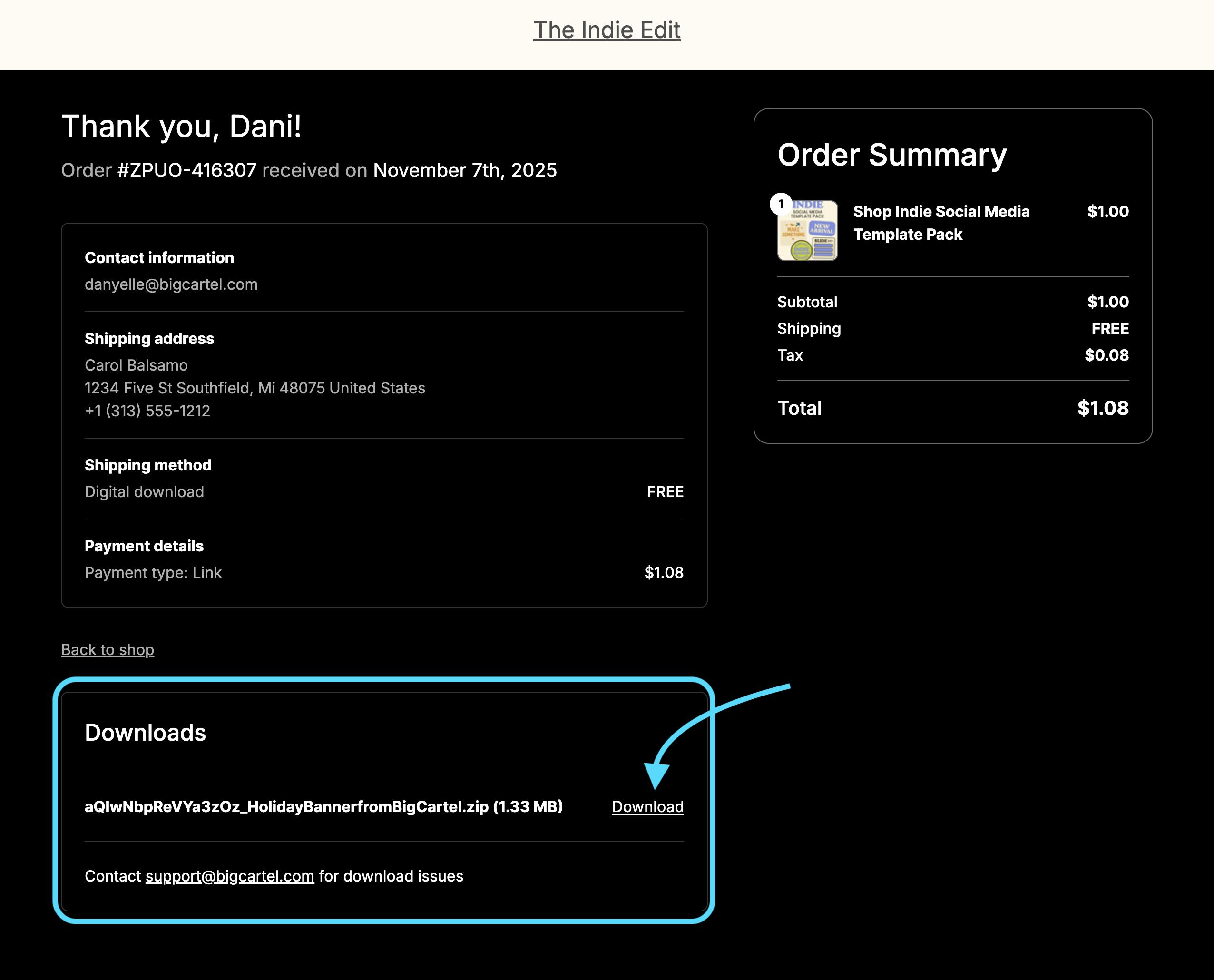 - Email Confirmation: A link to the receipt page is included in their order confirmation email, so they can easily return to download their files anytime.