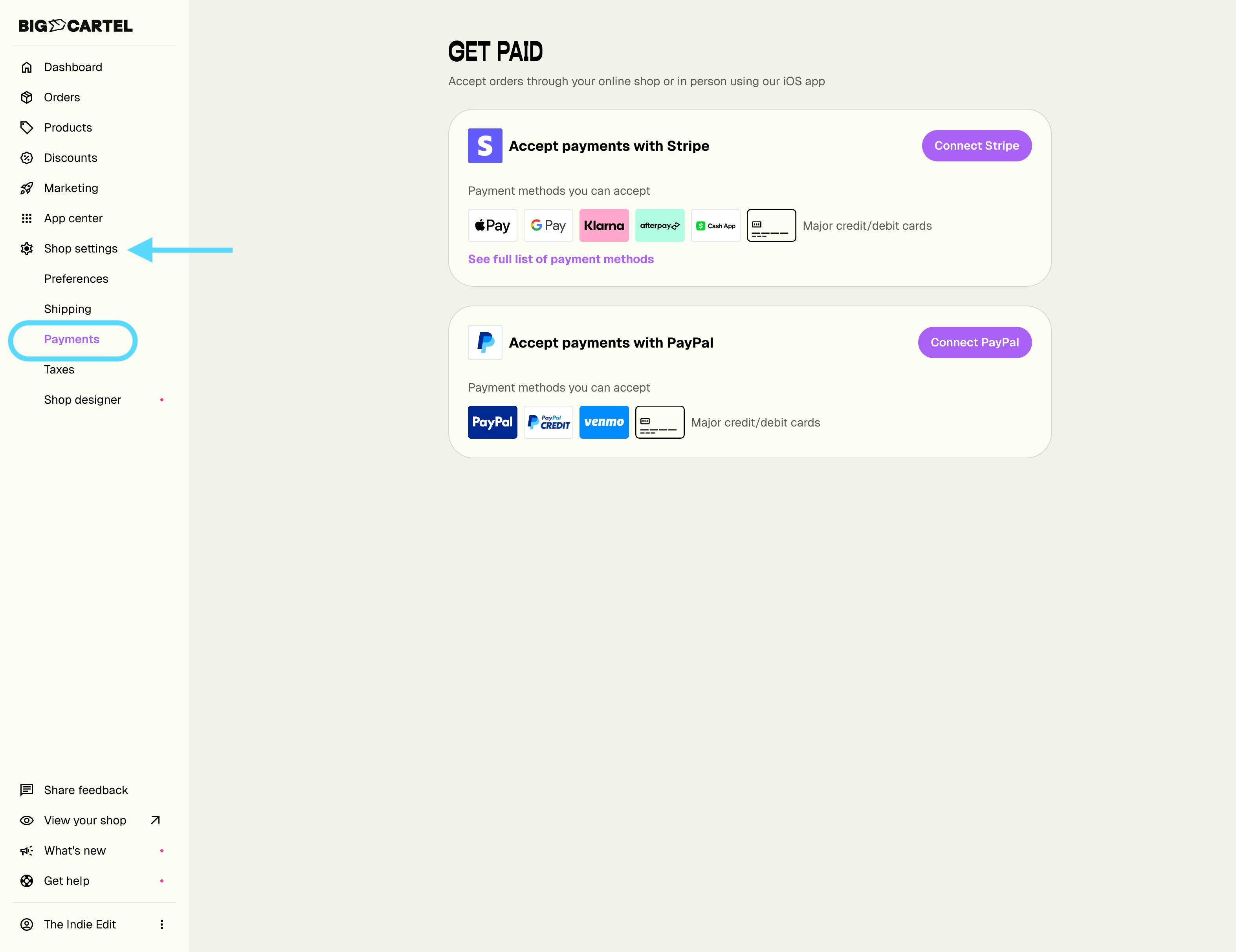 - Click Shop settings > Payments.